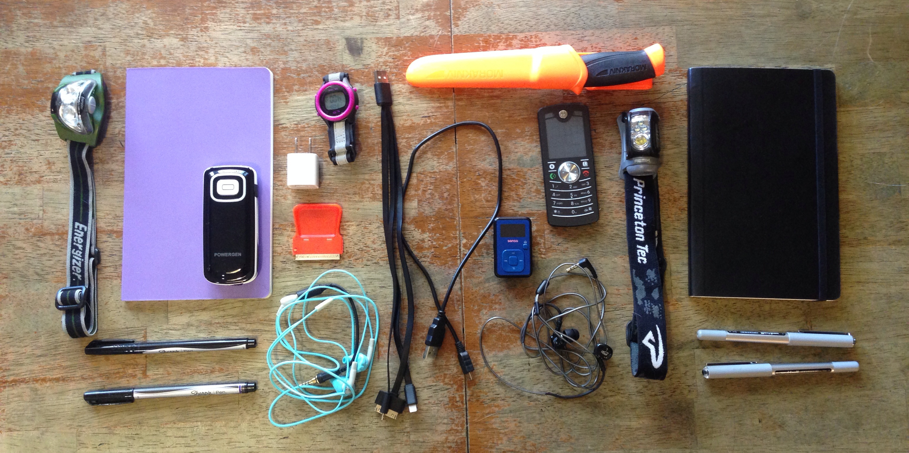 PowerGen 6000mAh charger, Sansa Mp3 player, x2 headphones, water resistant watch, and cords
